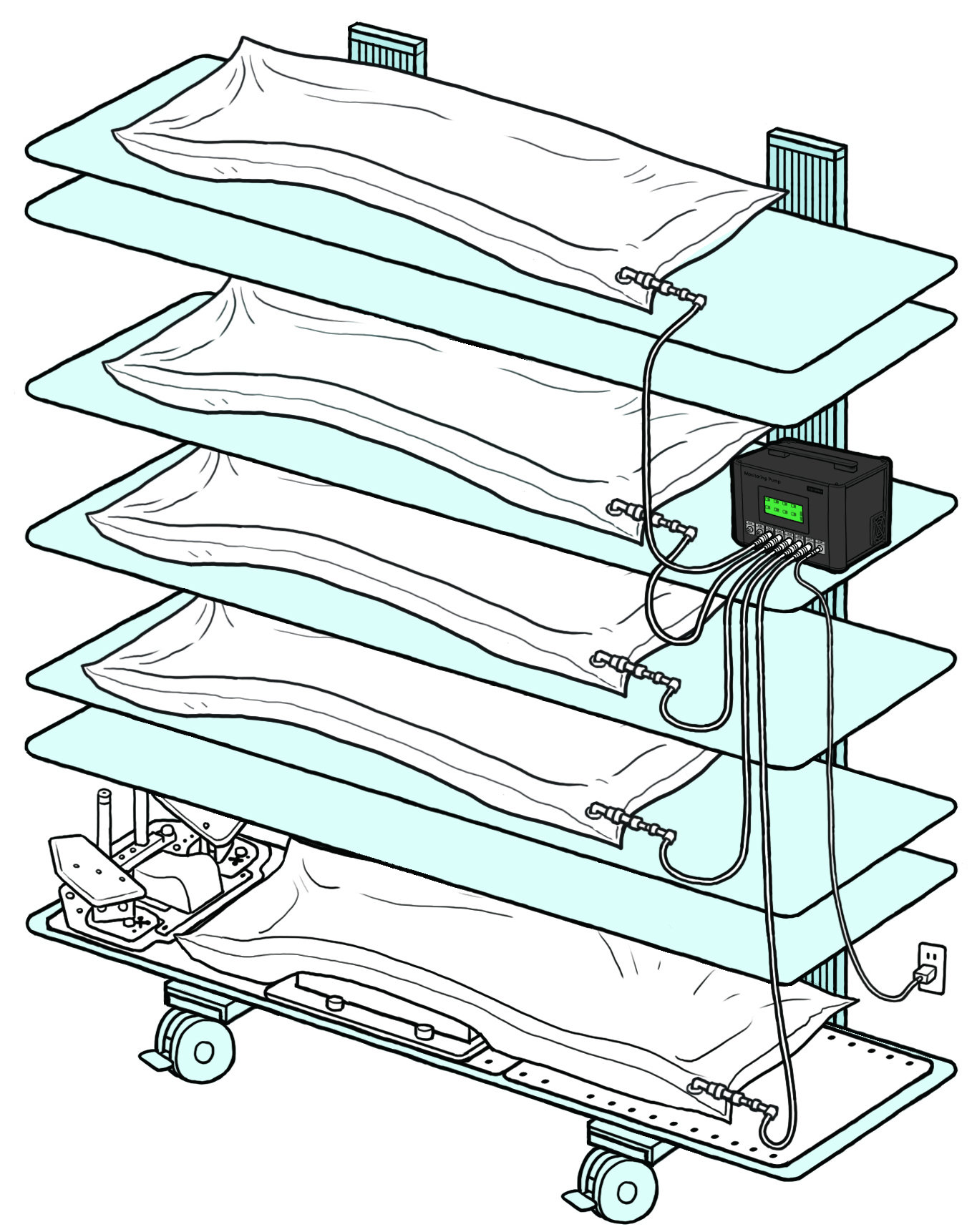 | 製品詳細 | 吸引式固定バッグ(ESF-19)が適切な圧力値を維持しているかをモニターします。 吸引式固定具を用いた際の精度担保においては、治療期間中の継続的な圧力管理が重要です(※1)。 圧力センサー内臓のポンプにより、吸引式固定具(※2)を規定圧力範囲内に維持するよう自動吸引します。最大8チャンネル同時接続可能です。 |